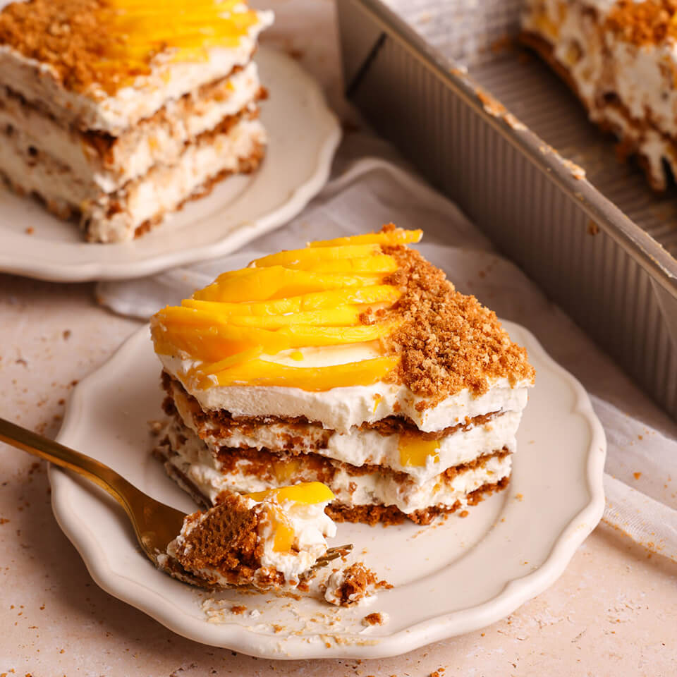 Zoha Malik specializes in “simple and indulgent bakes” on her blog Bake With Zoha. Her mango float comes together in under 20 minutes and makes a Biscoff cookie crust in place of a traditional graham cracker crust (though you can use graham crackers if you prefer).