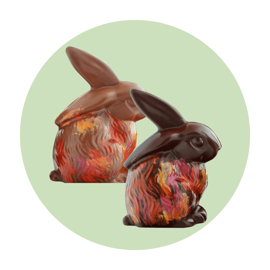 All of the chocolates from Vancouver’s GEM are made by hand and preservative-free with completely natural flavouring. The chocolate bunnies are available in milk or dark chocolate with an abstract painted design.