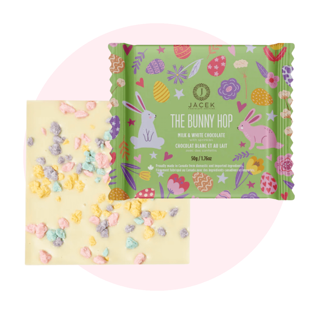BC’s Jacqueline Jacek likes to call herself “the world’s first Cocoanista” – that’s a combination between a fashionista and a chocolatier. Her Easter bars are 50% milk chocolate and 50% white with a colourful and crunchy confetti topping.