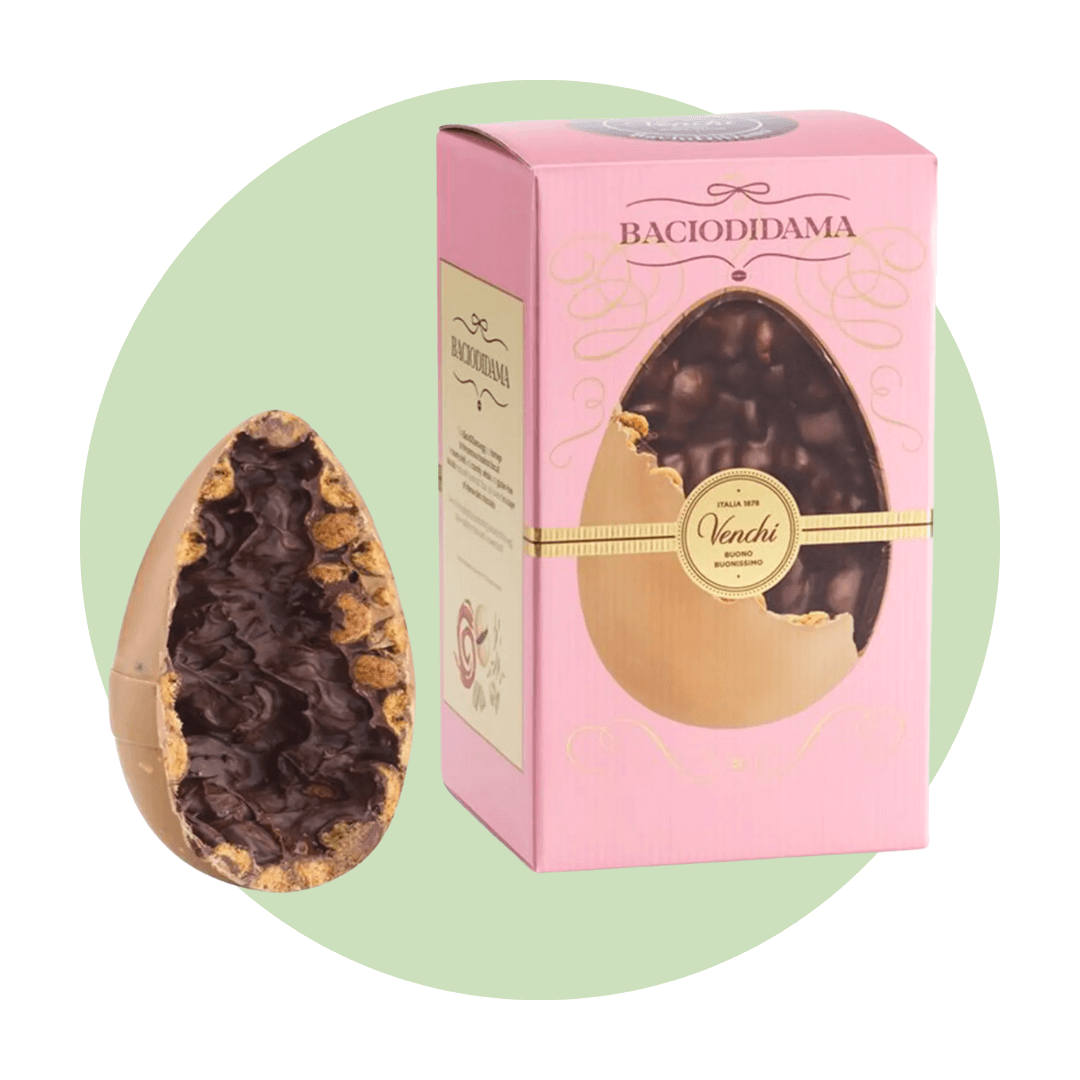 Bacio di Dama is a traditional Piedmontese dessert made with two hazelnut biscuit layers and a layer of chocolate. This elaborate Easter egg from Italian chocolatier Venchi combines them into a delicious chocolate shell.