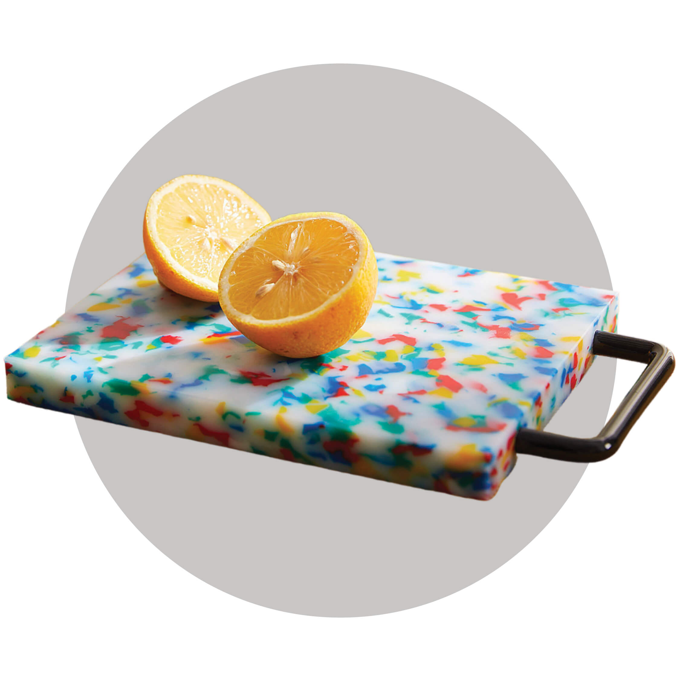 This weighty board is designed for both food preparation and presentation, with a whimsical confetti pattern on food-safe plastic. It’s also made with repurposed manufacturing waste from other cutting boards, so its user can chop with a clear conscience.