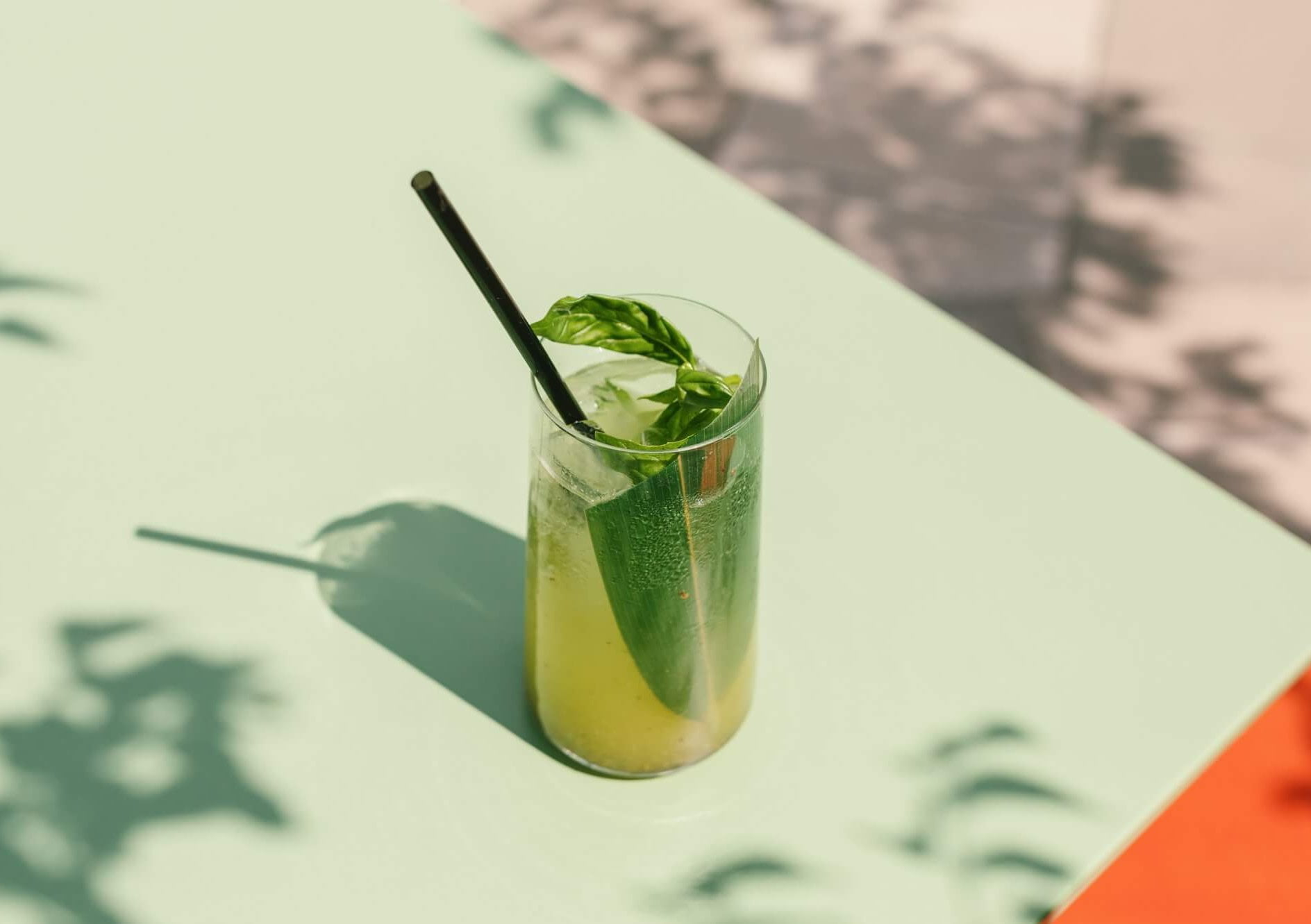 - Pour into glass and garnish with basil leaf and sprinkled lemon zest.