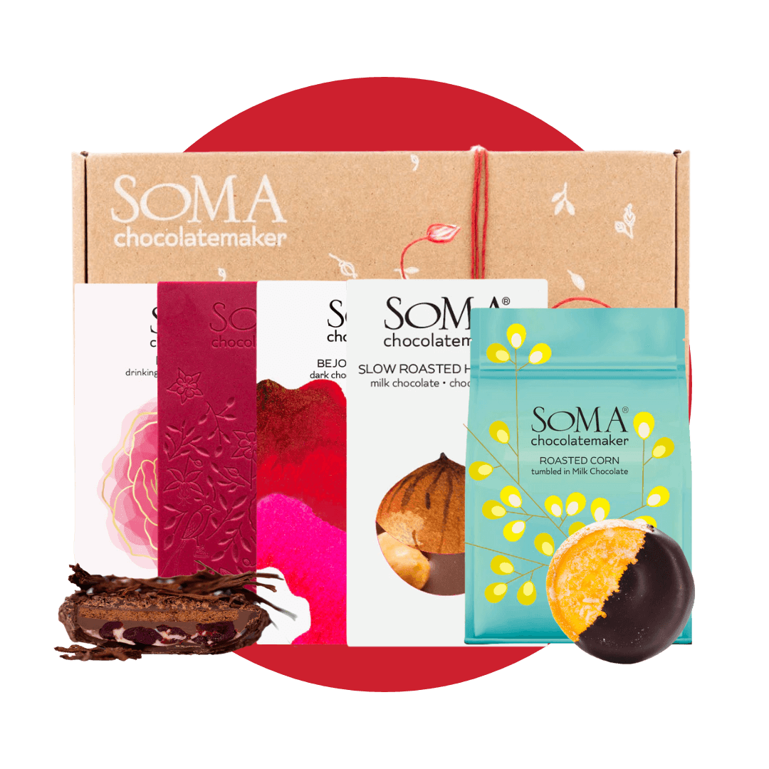 Toronto-based SoMA’s collection includes unique specialties, like Wild Heart, a giant shaggy Black Forest Cake truffle and their popular Roated Corn, salted corn pieces covered milk chocolate.
