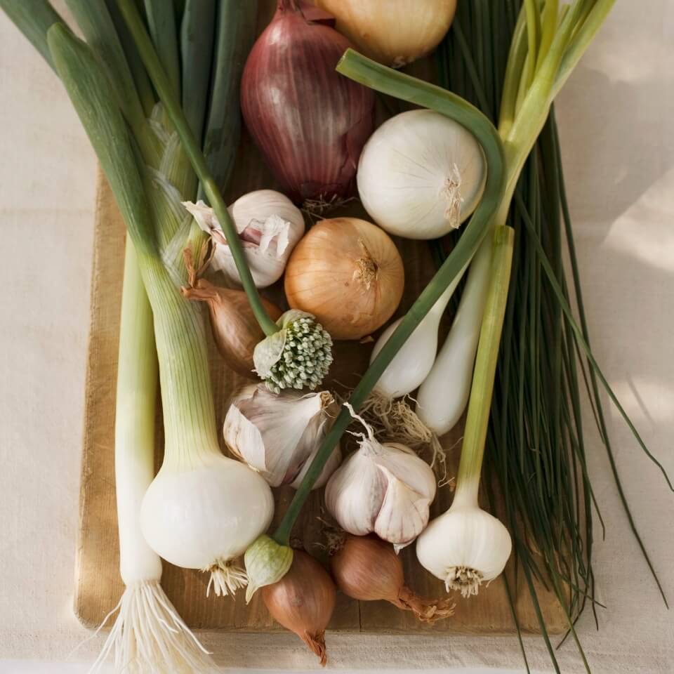 A ubiquitous aromatic and starting ingredient for sauces, stews, soups and other savoury dishes, onions are irreplaceable in most kitchens. There are hundreds of varieties, but the most common in Ontario are yellow cooking onions, red and white onions, green onions (or scallions), as well as pearl onions and shallots (smaller onion varieties that add a slightly sweet-smelling scent and flavour to many sauces and vinaigrettes).
