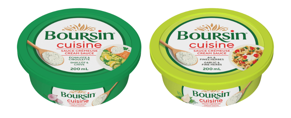 Two premium flavours – Boursin® Cuisine Shallot & Chives and Boursin® Cuisine Garlic & Fine Herbs – are both created with herbs, spices and a base of 100% Canadian milk and cream. Boursin® Cuisine is also co-manufactured in Quebec, which makes these cream sauces a local choice.