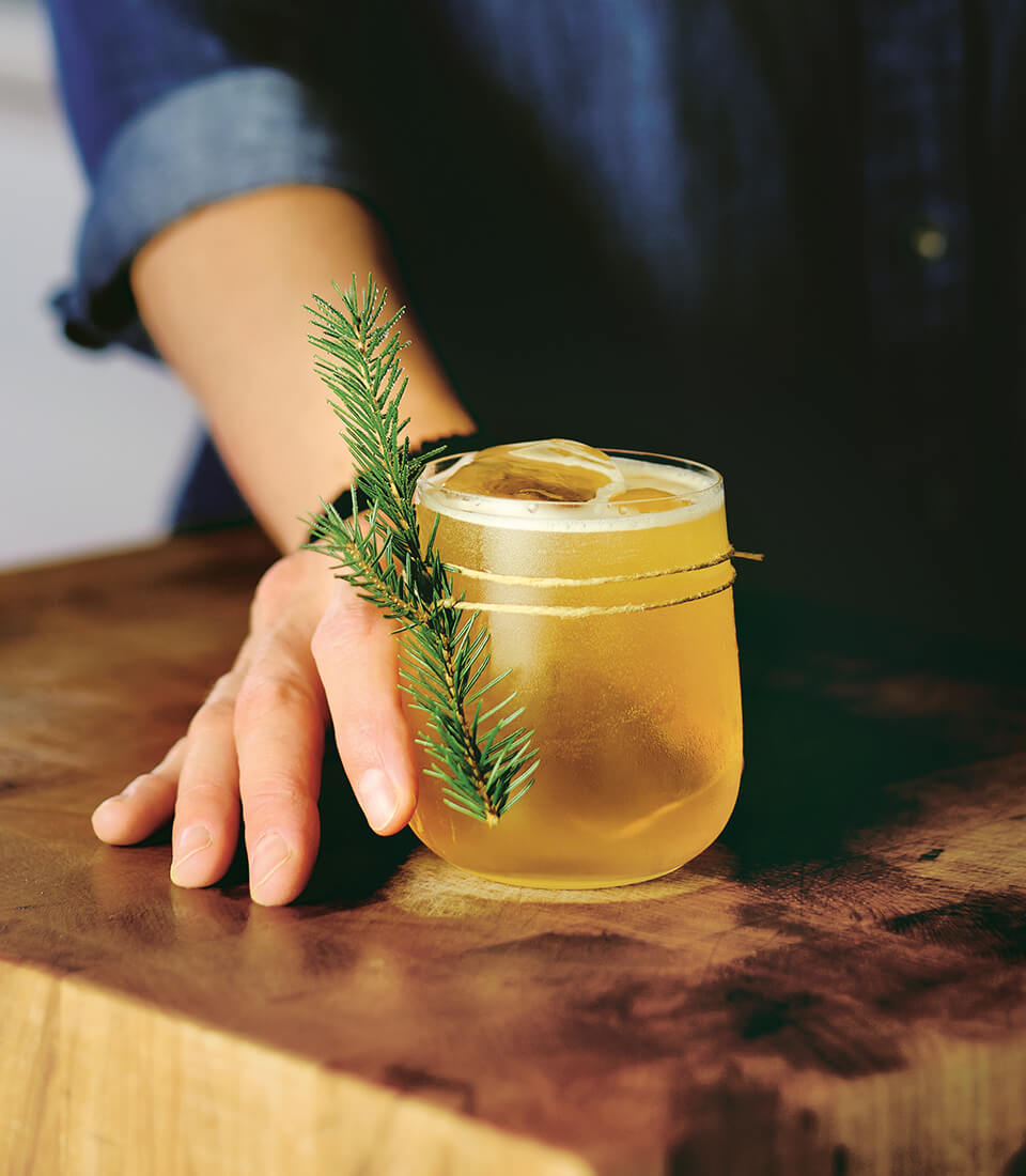 - Wrap highball glass with an evergreen sprig, affixing it to glass with kitchen twine or a rubber band, to create a mini “wreath.” Spray inside of glass with balsam spray; fill with ice.