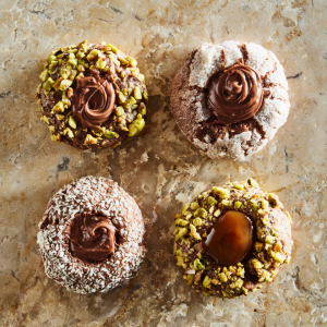 An easy wintertime classic cookie gets even more decadent with the addition of chocolate. Mix and match with Nutella for a chocolate hazelnut thumbprint cookie, or roll in pistachios and top with dulce de leche.