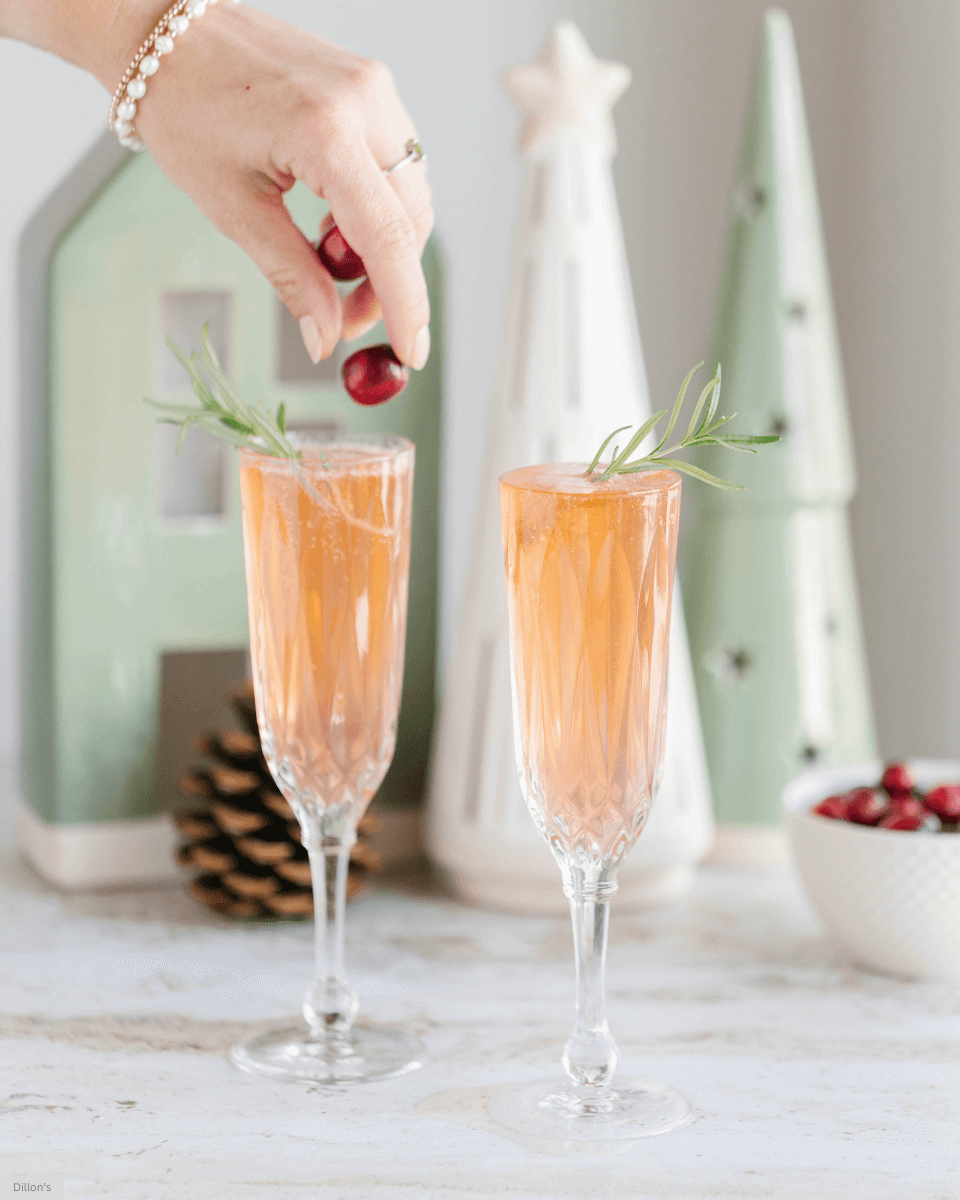 - In a mixing glass, combine Dillon’s Cranberry Gin and lemon juice. Add ice and stir until chilled. Pour into Champagne flute or coupe glass. Top with sparkling wine. Garnish with cranberries and fresh rosemary.