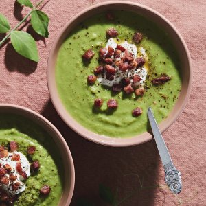 - To serve, divide soup among bowls and top each with 1 tbsp yogurt. Add spoonful of either pancetta or pine nuts and sprinkle with mint and pepper to taste.
