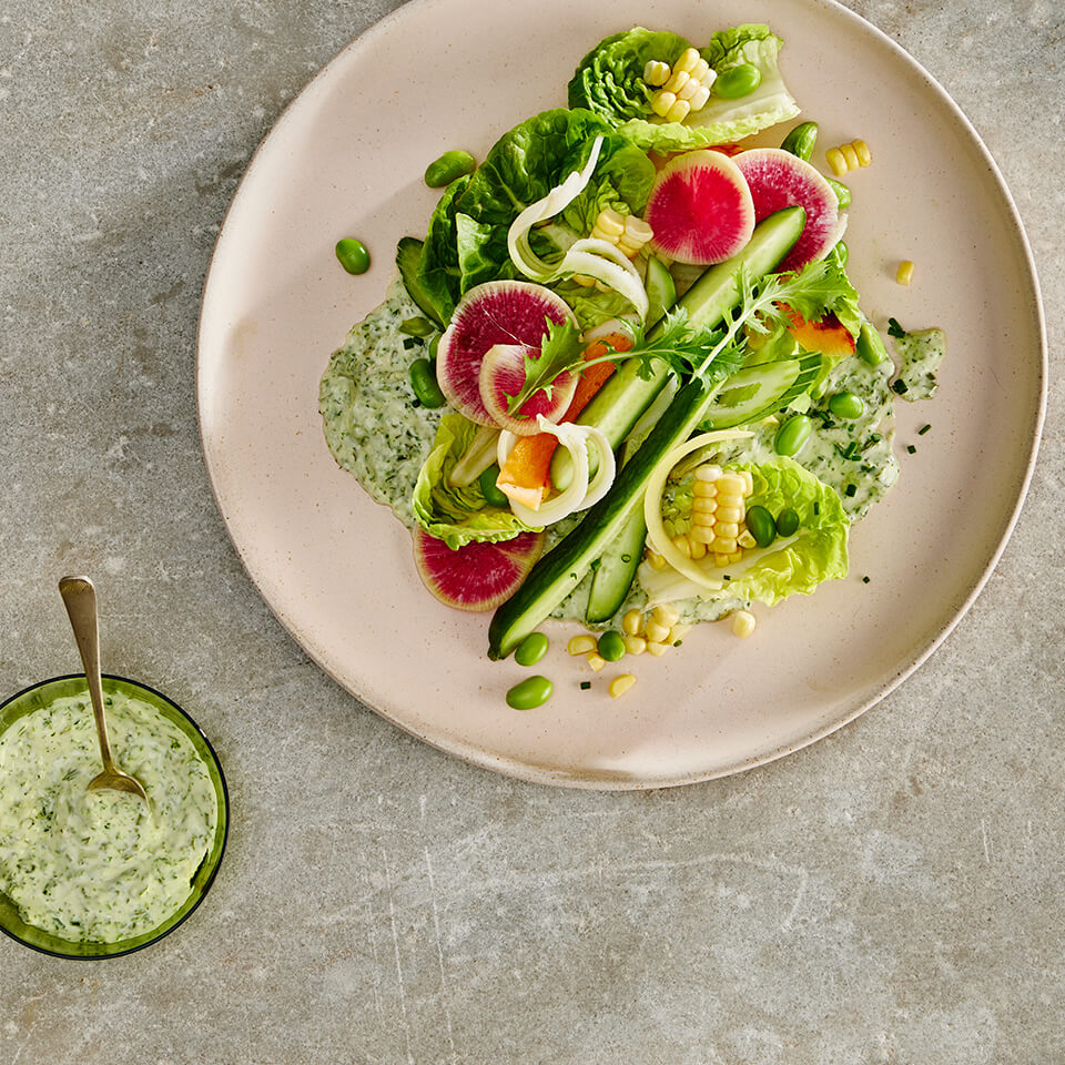 This refreshing dressing is one for your repertoire. We’ve paired it with our version of a “crudité” salad: a mix of crunchy greens, including baby romaine and cucumber, edamame, radishes and ribbons of heirloom carrots and fennel. You could also add avocado, cherry tomatoes and cucumber wedges.