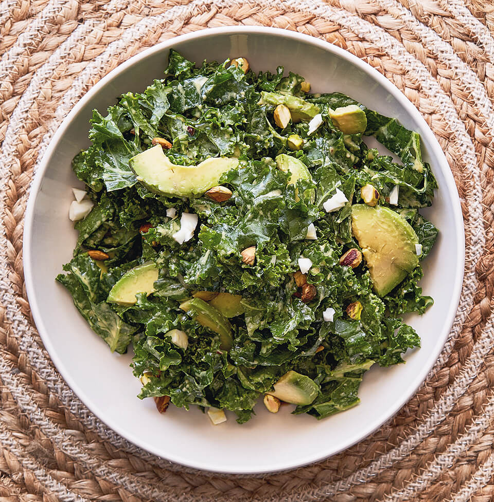 Kale loves bold flavours and contrasting textures. Creamy ingredients like avocado or goat cheese balance its earthy taste, while nuts like pistachios or almonds add crunch. Sweet elements like dried cranberries or fresh fruit (think apple or pear) bring a nice contrast, and a bright, zesty vinaigrette ties everything together.