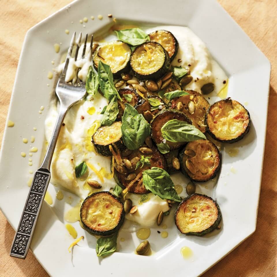 Meni Valle's recipe for roasted zucchini with labneh, fresh basil and pumpkin seeds.