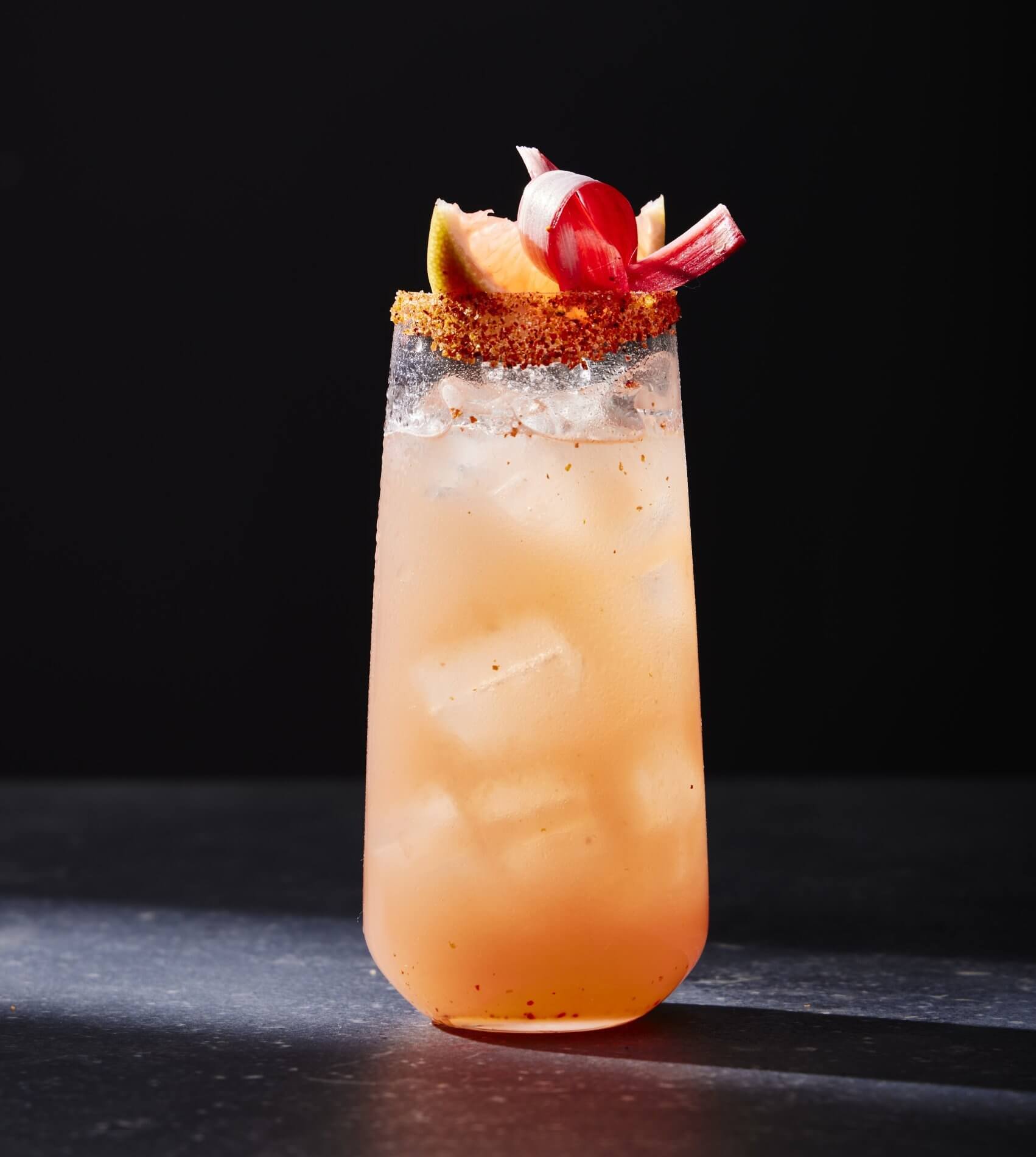 - Rub a Collins glass with a grapefruit wedge; dip in small plate of Tajín to coat rim. Fill glass with ice.