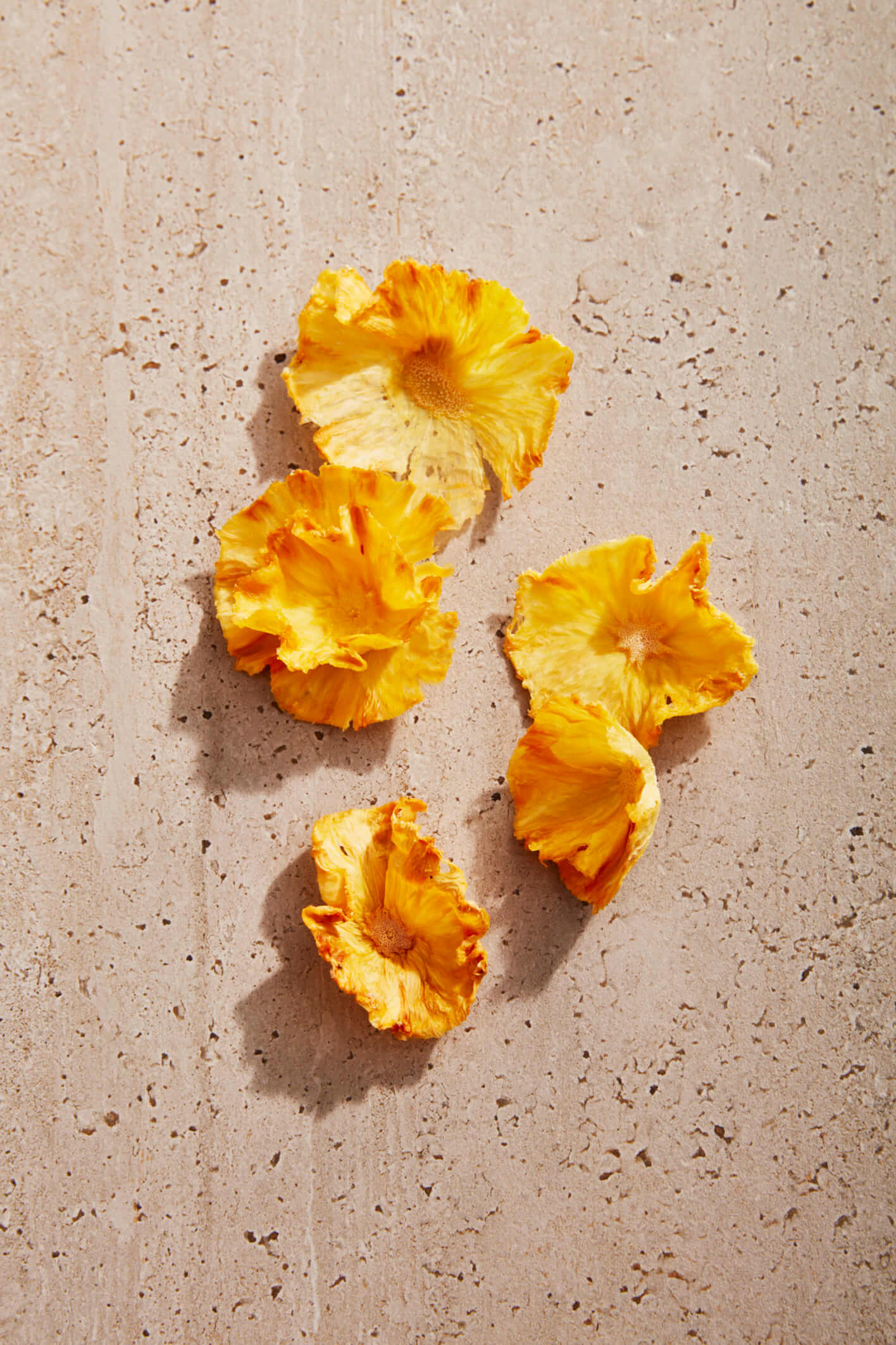 - Cut pineapple into super-thin rounds using a mandoline; pat dry and arrange tightly on a parchment paper–lined baking sheet. Bake in a 200°F oven until edges are light brown and dried, 90 to 120 minutes. Carefully place into muffin tin cups to shape them as they cool.