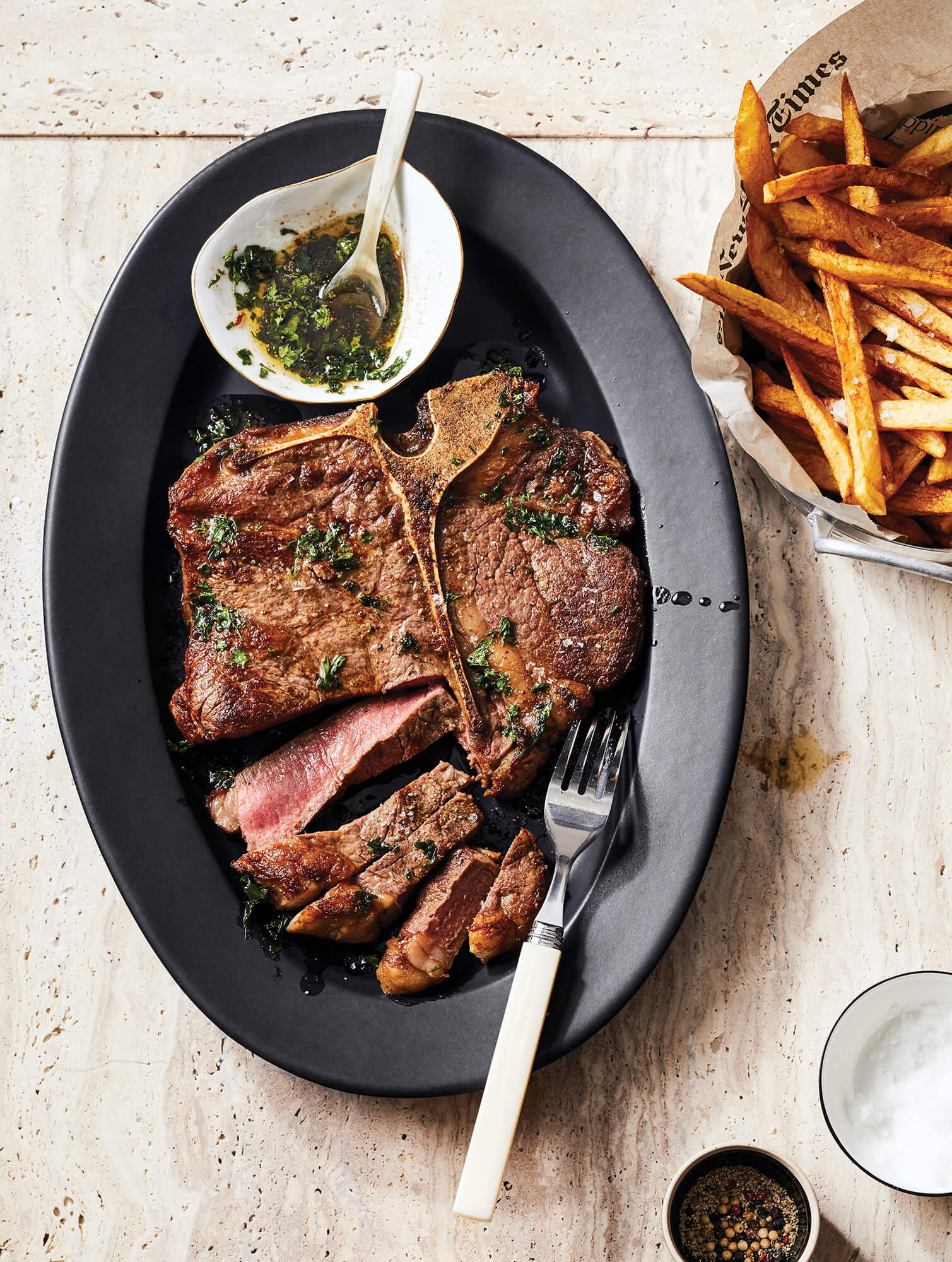 Porterhouse is the loin cut of beef – think T-bone but bigger and more fun to share. Crispy fries and an anchovy-parsley butter complete this bistro-style dinner.