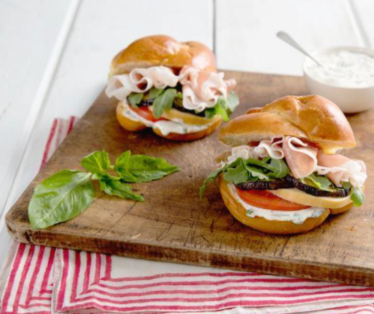 A fresh twist on an Italian classic: Layer ripe tomatoes, smoked mozzarella, baked eggplant slices, arugula and Prosciutto di Parma PDO on an egg twist roll, then top it off with fresh basil aioli. It’s savoury, juicy, and just the right amount of indulgent.