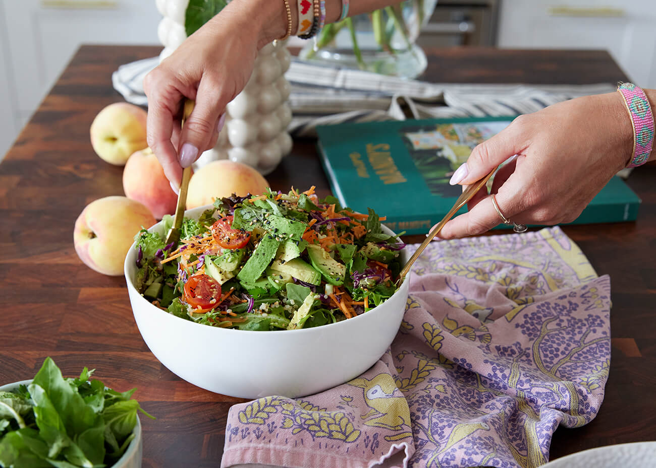 “We really inspire each other,” says Mandy, who is the chef behind the bowls, while Rebecca designs the brand’s gloriously vibrant and prettily patterned eateries. “Becca makes everyone feel like they can do anything. And where I’m extra in food, Becca is extra in design.” Not that you’d know it from Rebecca’s quiet white kitchen. “Calm and peace are really important to me at home,” she says. “Both of us have kids under 10, and I have a dog, so there’s inevitable chaos in the kitchen. This minimalist backdrop gives me a sense of serenity.”