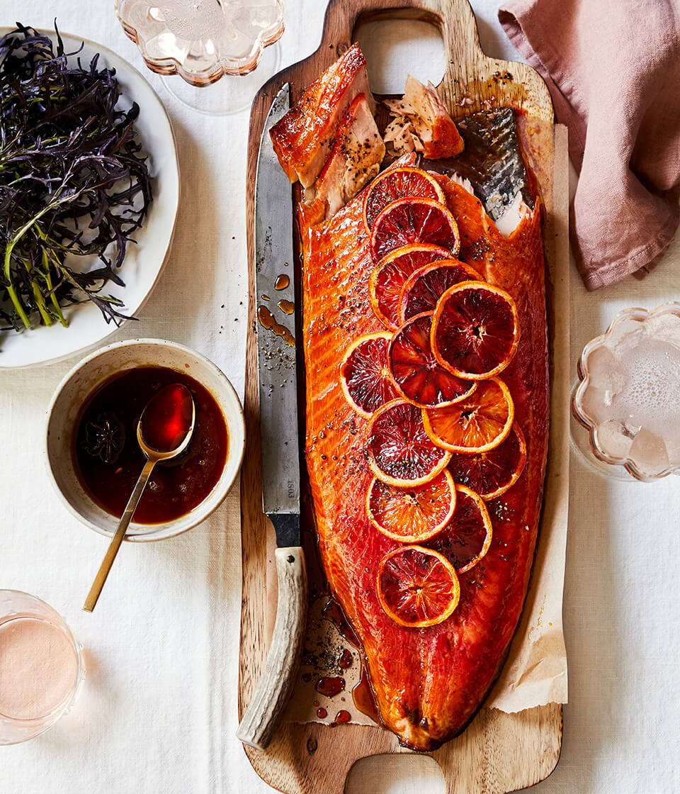 Salmon roasted with a gin, star anise and soy glaze, topped with caramelized orange slices.