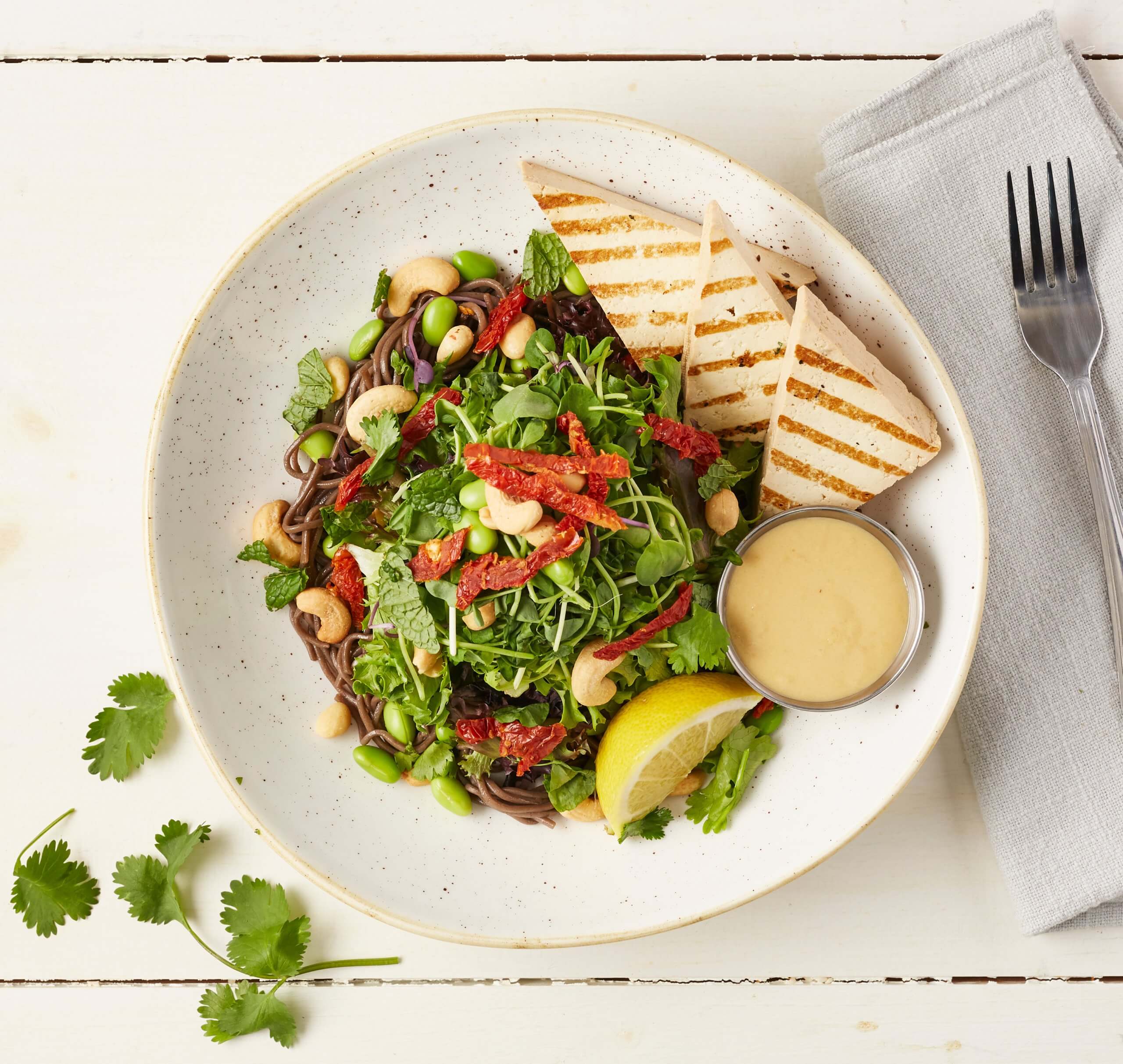 The recipe for Fresh Kitchen + Juice Bar's 'Noodlerama' salad, featuring soba noodles, greens, nuts, omega-rich dressing and grilled tofu steaks.