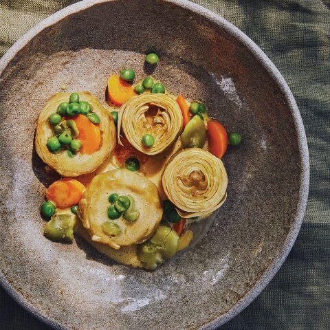 Bika’s Artichokes With Green Peas, Broad Beans and Sabayon of Verjus A seasonal Spring recipe from Bika Farm & Cuisine in Quebec.