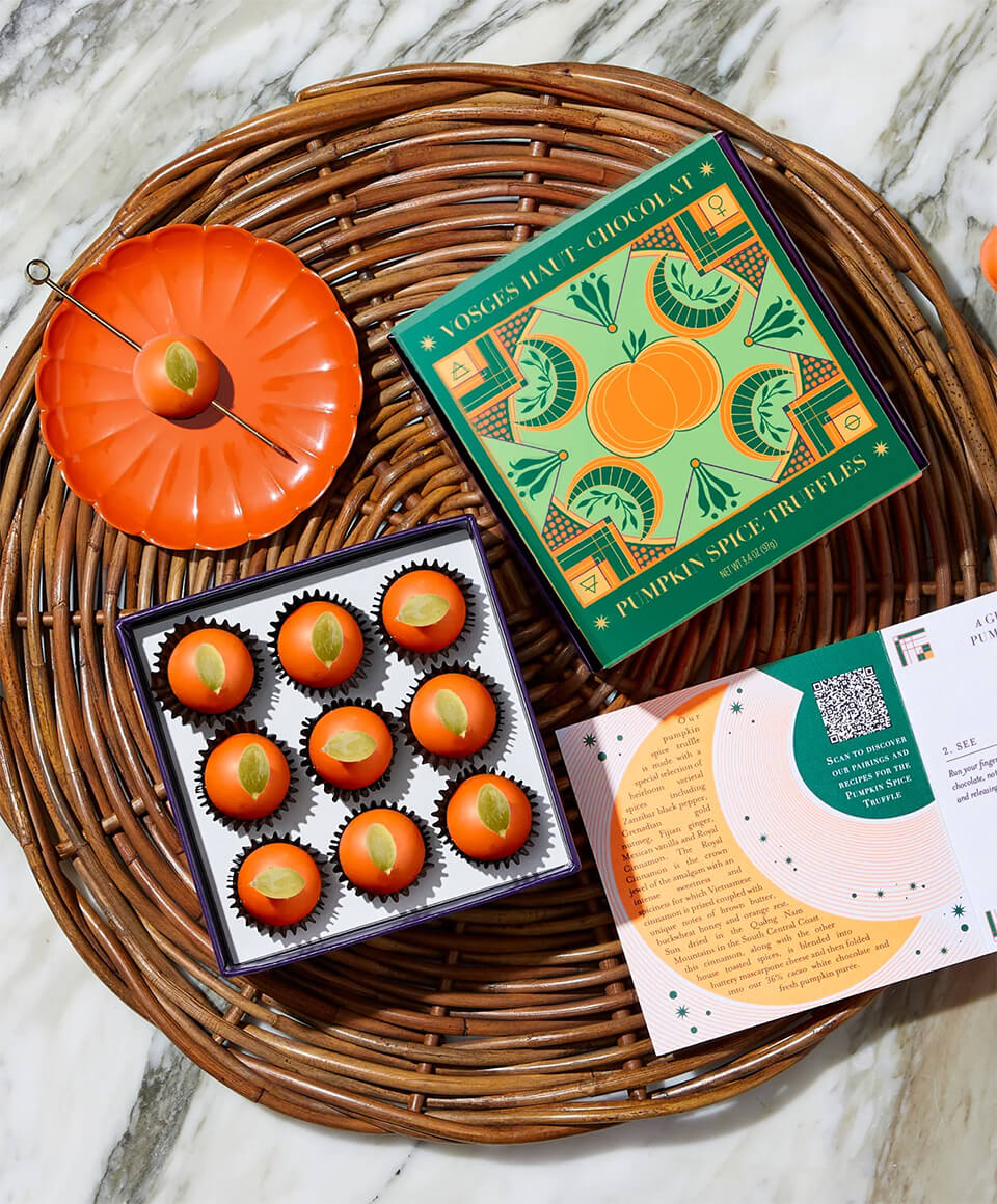 These opulent Fall truffles are the ultimate seasonal treat. Vietnamese cinnamon and other spices are blended with mascarpone cheese, 45% cacao chocolate and pumpkin purée.
