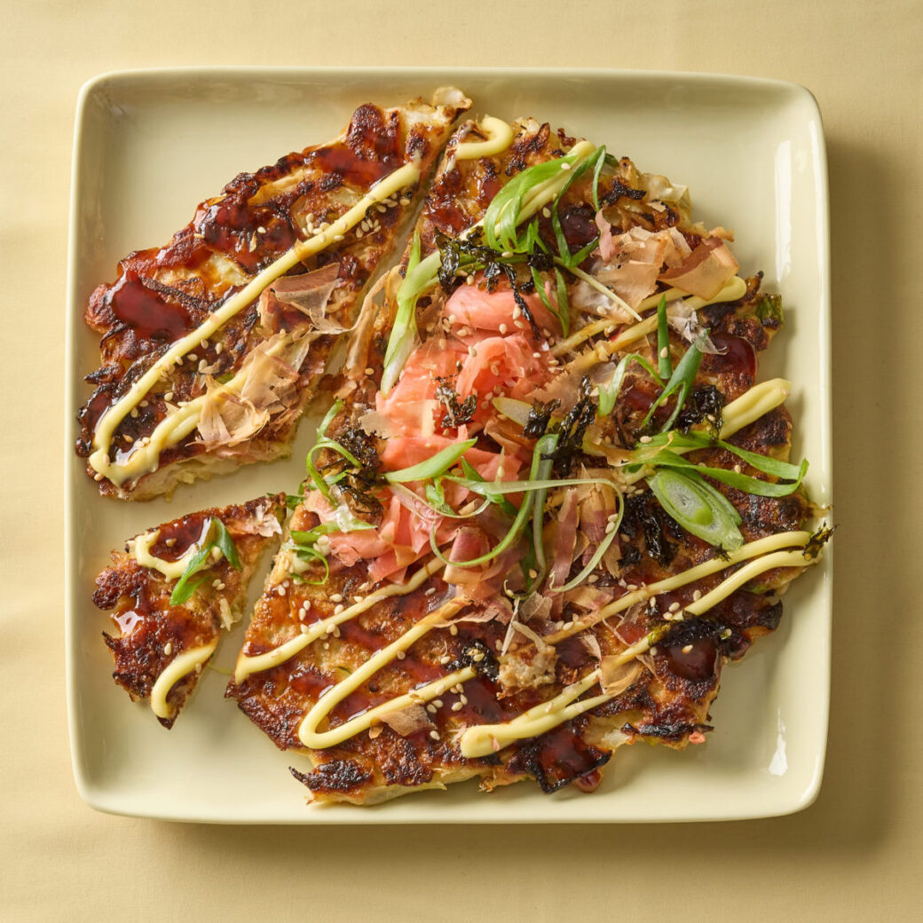 Cooked until crisp at the edges and tender in the centre, the delicate sweetness of lightly charred cabbage is highlighted by the tangy okonomiyaki sauce and salty, pickled toppings.