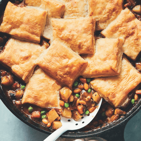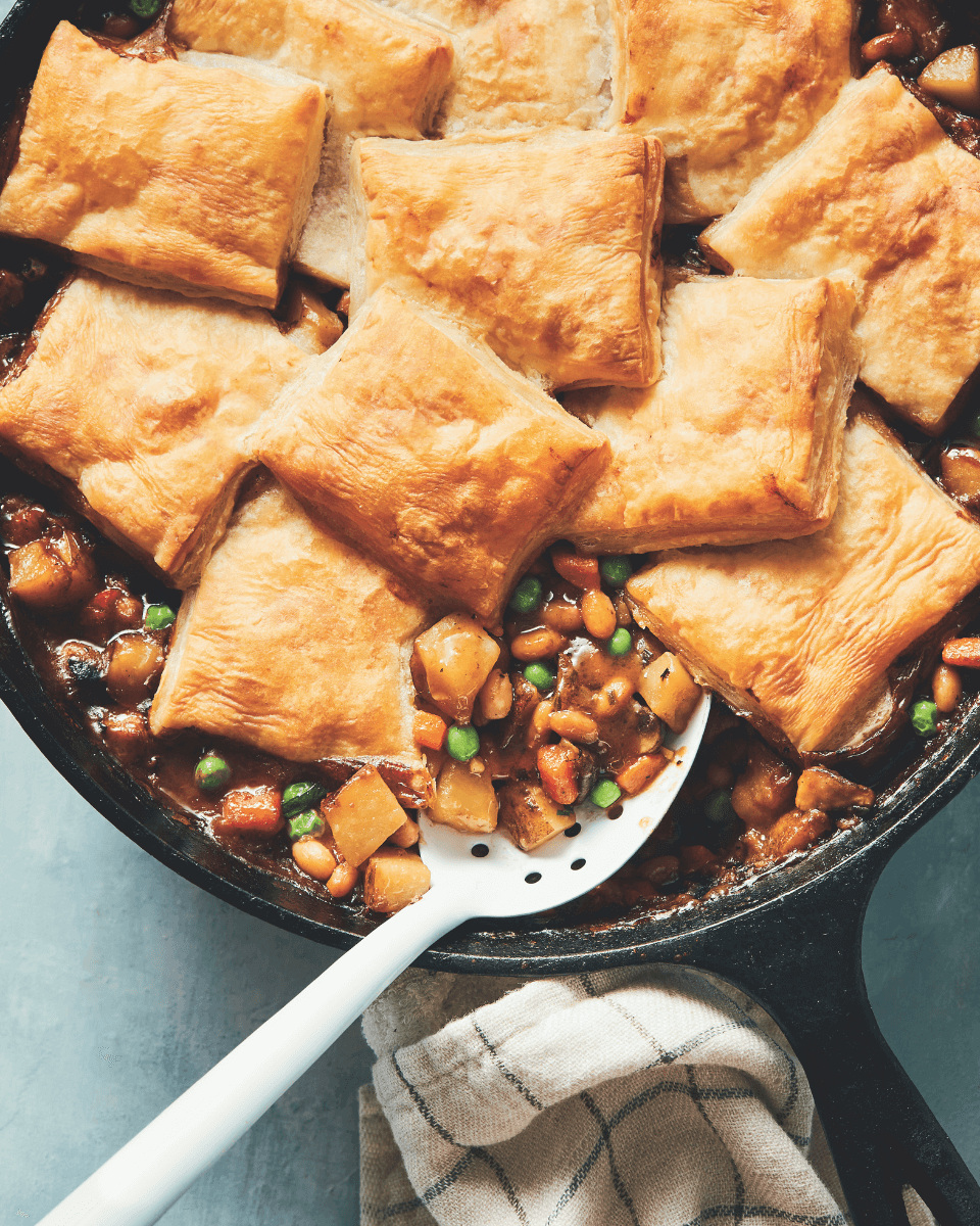 This veggie skillet pot pie is featured in Beaudoin’s recent book, Evergreen Kitchen: Weeknight Vegetarian Dinners For Everyone. In her book, Beaudoin explains what makes this dinner so special. “This dish is the ultimate comfort food. It’s a stick-to-your-ribs meal that won’t leave you needing to take a nap afterwards. The base is made with potatoes, carrots, mushrooms, and green peas coated in a delicious gravy. We even sneak some beans in for extra protein. Everything gets topped with a shatteringly crisp golden-brown pastry. Store-bought puff pastry saves the work of fussing around with a traditional crust. Better yet, this entire dish comes together in a single pan, which can also be brought directly to the table.”