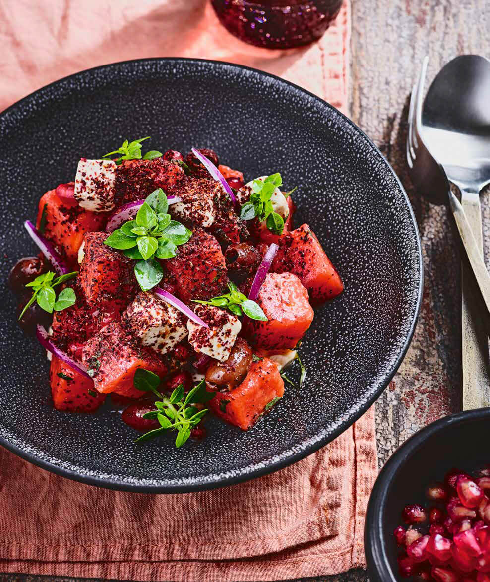 - Arrange the watermelon cubes, red onion, olives and feta in a salad bowl. Add the vinaigrette and chopped flat leaf parsley and mix thoroughly. Taste and season if necessary. Sprinkle with sumac, pomegranate seeds and dwarf basil and serve.